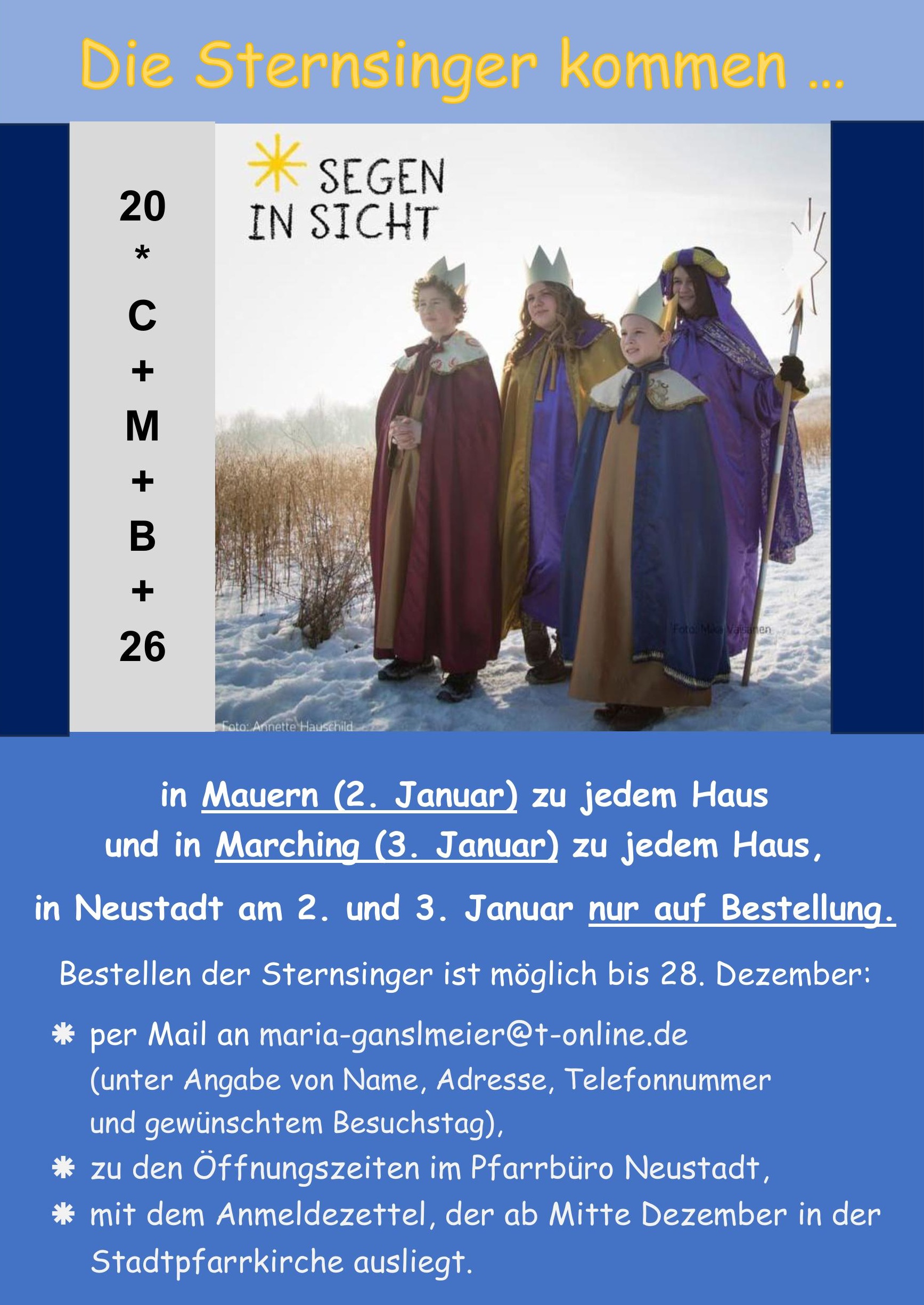 In Neustadt ist es für die Sternsinger nicht möglich, an jeder Haustüre zu klingeln. Hier werden die Sternsinger nur „auf Bestellung“ unterwegs sein, sie kommen also nicht automatisch. Das ist für die Kinder und Jugendlichen leider nicht zu schaffen. Aber natürlich werden sie den Segen zu all denen bringen, die einen Besuch wünschen und sich über die Sternsinger freuen. Bitte melden Sie sich dazu einfach an: „Bestellen“ können Sie den Sternsingerbesuch bis spätestens Sonntag, 28. Dezember 2025 entweder telefonisch im Pfarrbüro Neustadt zu den Bürozeiten (Tel.: 09445 / 95600) oder per Mail unter maria-ganslmeier@t-online.de. In der Stadtpfarrkirche werden ab Mitte Dezember auch wieder Anmeldezettel ausliegen.