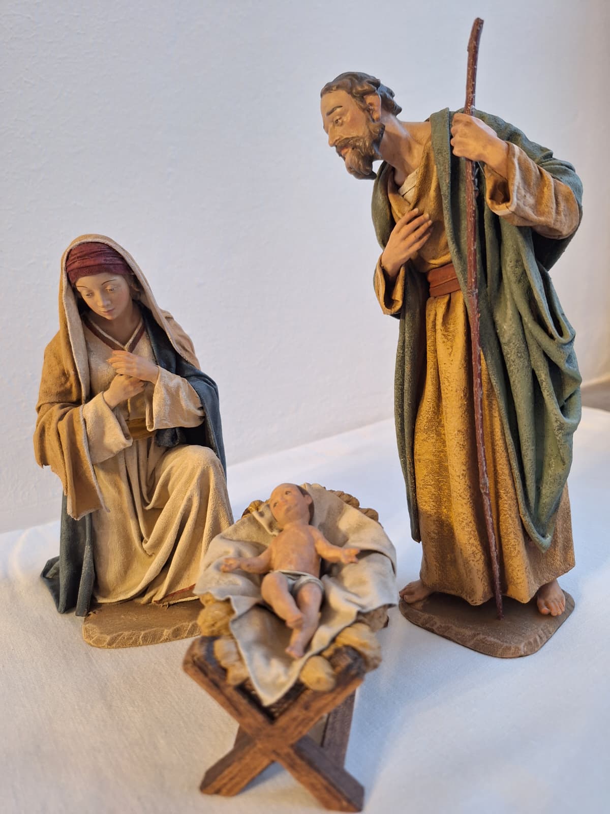 Unsere alten Krippenfiguren sind sehr in die Jahre gekommen; gerade die Gesichter sind teilweise bis zur Unkenntlichkeit entstellt. Darum haben wir heuer gemacht, was wir schon lange planen, und neue Figuren angeschafft. Ein Team des Pfarrgemeinderats hat sich auf die Suche gemacht und ist fündig geworden: bekleidete Holzfiguren wie bisher, die gut in unsere Kulisse passen.