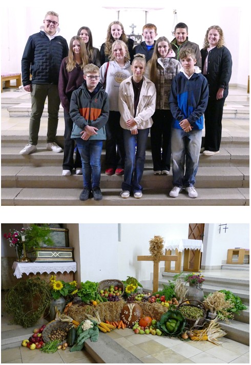 Am Samstag vor dem Erntedankfest haben sie den prächtigen Erntedank-Altar in der Pfarrkirche St. Vitus mit Obst, Gemüse und Früchten aus den Feldern und Gärten aus Geibenstetten und Mühlhausen gestaltet.