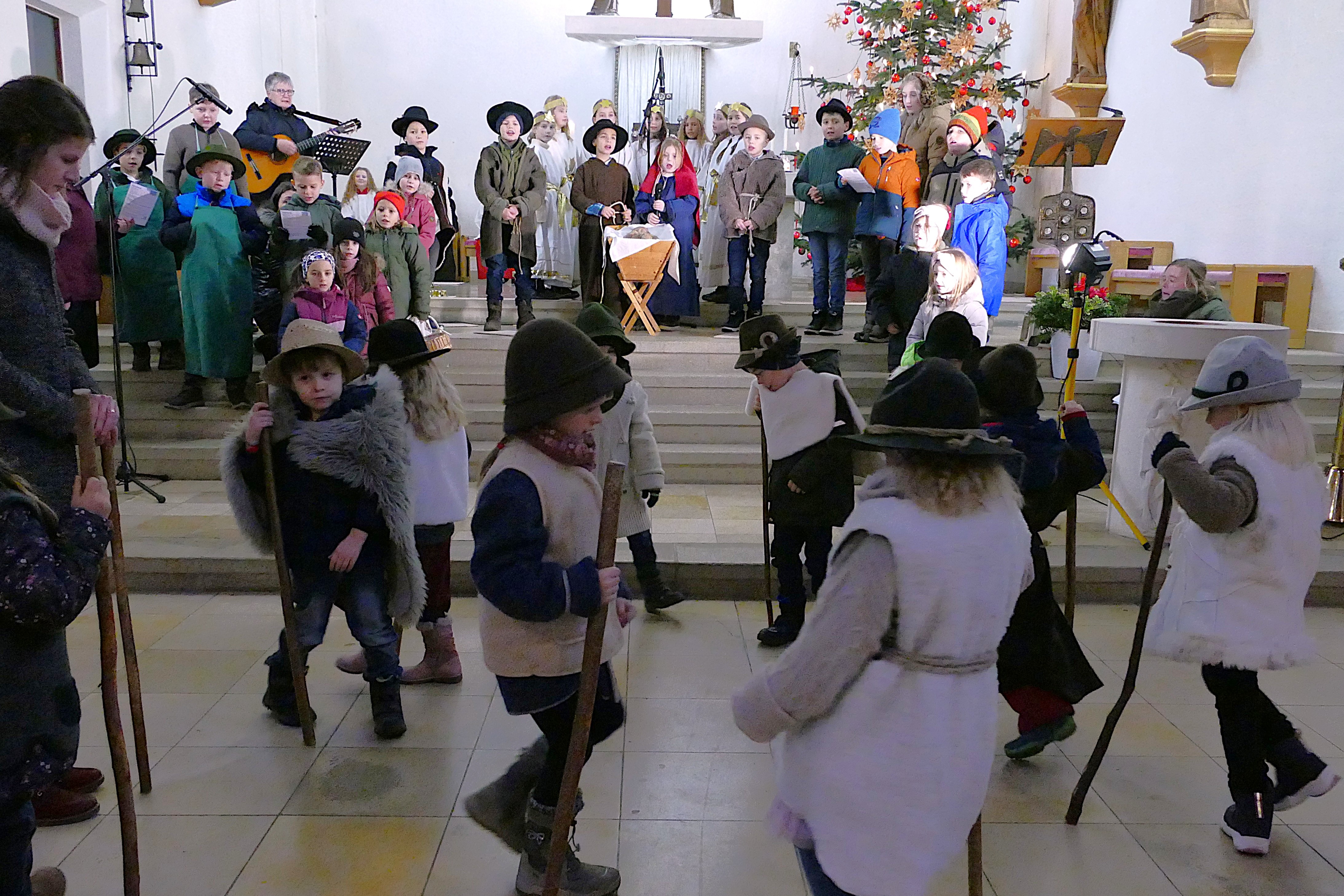Dort huldigten zehn Vorschulkinder des Kindergartens St. Franziskus beim Hirtentanz mit ihren Stöcken auf den Boden klopfend das neugeborene Kind. So manche Eltern erinnerten sich daran, wie sie als Kind auch schon beim Krippenspiel dabei waren.