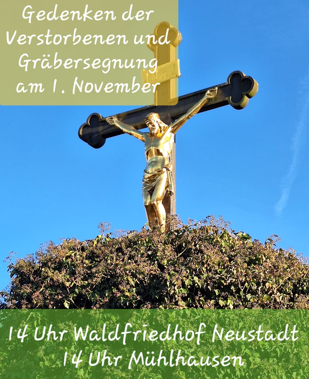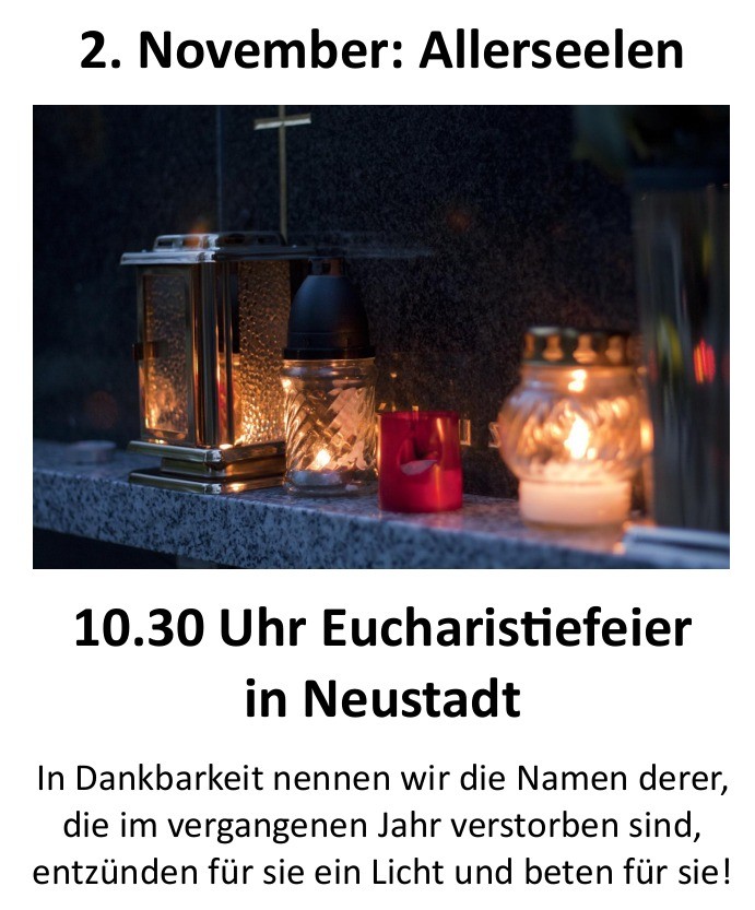 •	Am 1. November ist um 14 Uhr auf dem Waldfriedhof Neustadt ein Wortgottesdienst zum Totengedenken. Die Gläubigen versammeln sich am Leichenhaus; dort findet das gemeinsame Gebet statt. Zur Segnung der Gräber gehen dann alle zu den Grabstätten.