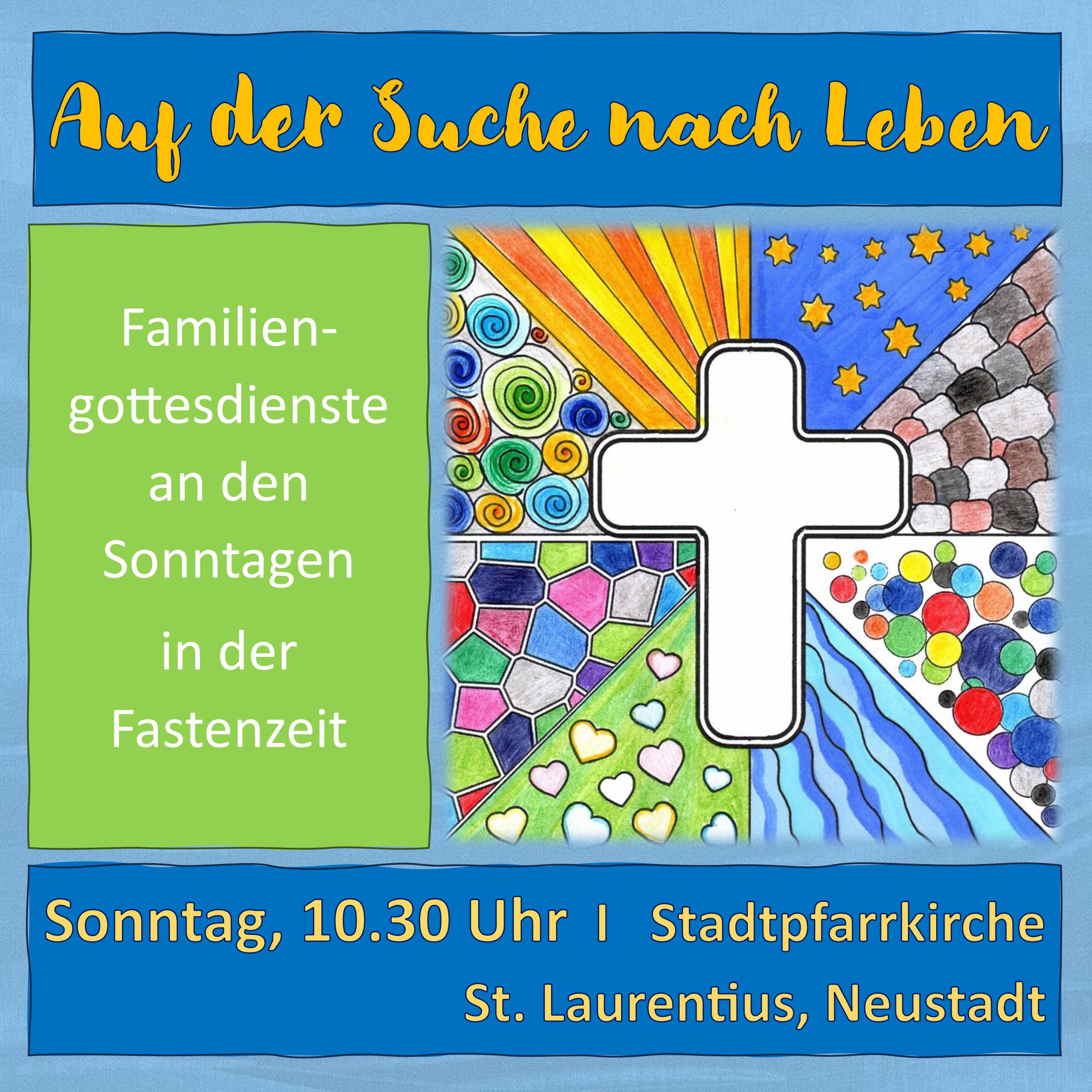 Unsere Sonntagsgottesdienste um 10.30 Uhr in Neustadt sind in der Fastenzeit besonders für Kinder und Familien gestaltet. Gemeinsam sind wir auf dem Weg zum Osterfest und entdecken dabei Schritt für Schritt das Kreuz als Zeichen des Lebens. Das große Kreuz beim rechten Seitenaltar der Stadtpfarrkirche bekommt dabei immer neue Farben und Symbole und erzählt von unserer „Suche nach dem Leben“. Für die Kinder gibt es nach jedem Familiengottesdienst Mosaik-Steine als Mitnehmsel, aus denen am Ende der Fastenzeit ein Lebenszeichen entstehen wird.