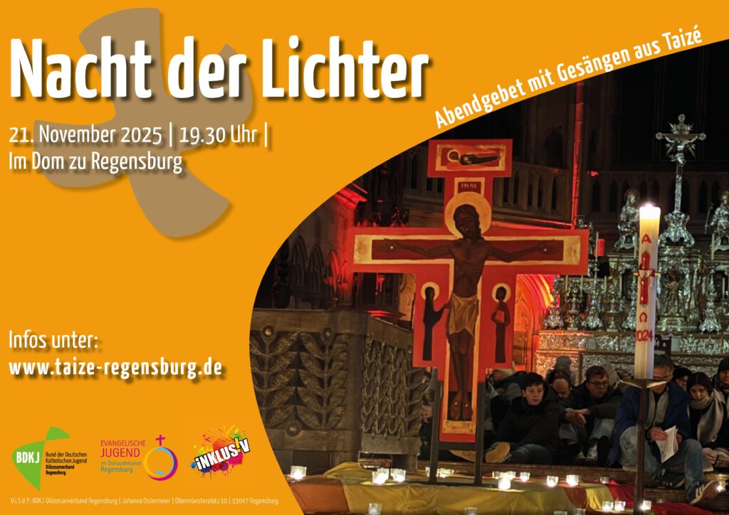 Der BDKJ und die Evangelische Jugend von Regensburg laden am Freitag, 21. November ab 19.30 Uhr zur „Nacht der Licher“ ein - eine Nacht, in der der Regensburger Dom in einem Meer vieler kleiner Lichter erleuchtet wird. Die Stille und die Lieder von Taizé laden ein, anzukommen und abzuschalten.
