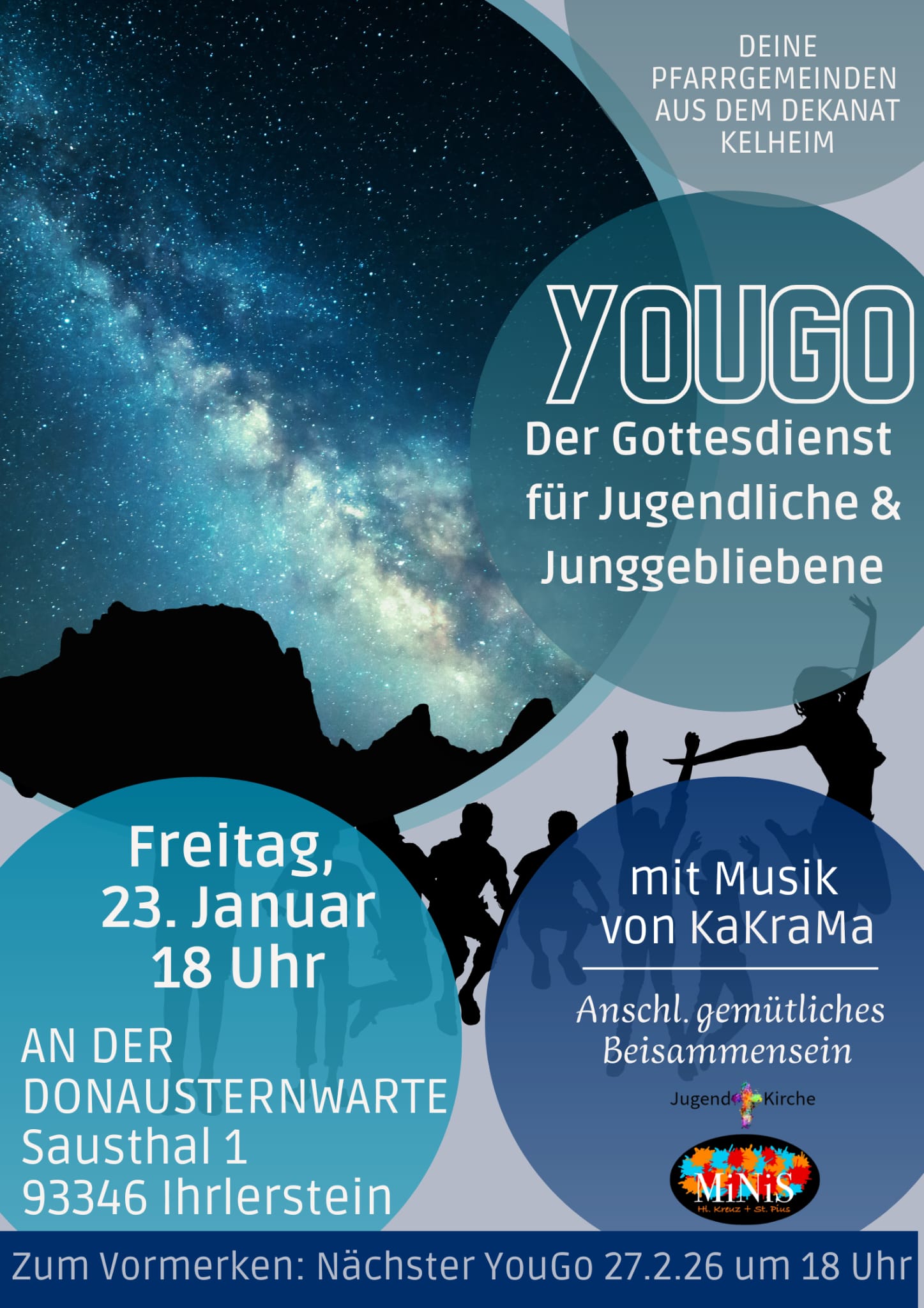 Die Pfarrgemeinden aus dem Dekanat Kelheim laden am Freitag, 23. Januar 2026 wieder zu einem Jugendgottesdienst an einem besonderen Ort ein. Dieses Mal treffen wir uns an der Donausternwarte (Sausthal 1, 93346 Ihrlerstein). Miteinander wollen wir über das Suchen und Finden nachdenken und uns von biblischen Erzählungen Mut machen lassen. Auch kleine Aktionen zum Mitmachen werden nicht fehlen. Für die passende Musik sorgt KaKraMa.